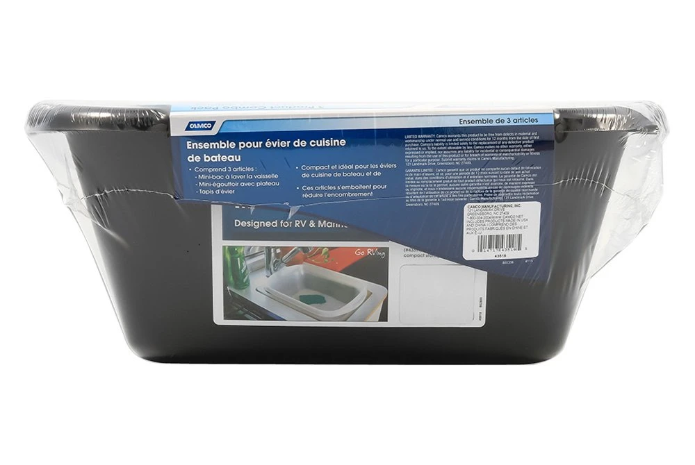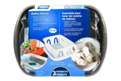 White Plastic Galley Sink Kit (43518) by Camco®. The Camco Sink Kit makes doing dishes in your RV a breeze. The dish drainer can hold full sized plates, cups and utensils for up to six people. The sloped tray helps excess water run off into your sink and doubles as a lid. The dish pan and sink mat all nest together with the dish drainer for compact storage. Perfect for galley sinks and limited counter space.