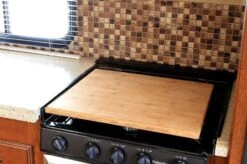 Bamboo Silent Top with Flexible Cutting Mat (43571) by Camco®. Camco RV Universal Stovetop Cover silences annoying stovetop rattles and adds valuable counter space to your RV. Solid hardwood stovetop cover hides and protects burners. Non-toxic gloss finish for extra moisture protection.