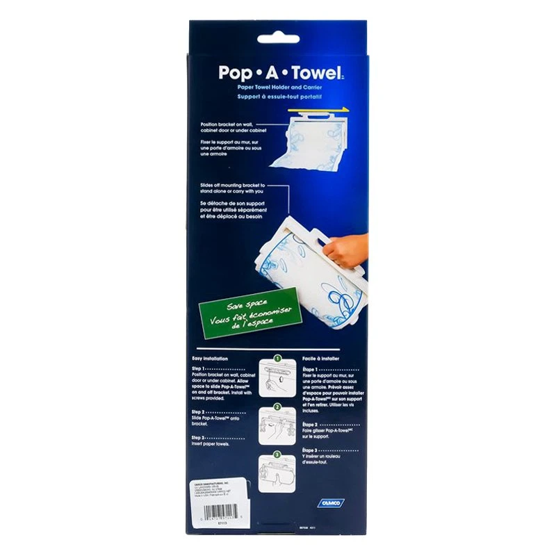 Pop-A-Towel™ Black Plastic Paper Towel Holder & Carrier (57113) by Camco®. Camco RV Pop-A-Towel is intended to keep the paper towels clean and conveniently located. This can be permanently mounted on cabinet door, wall or under cabinet. It slides off the mounting bracket to stand alone or carry as needed for your convenience.