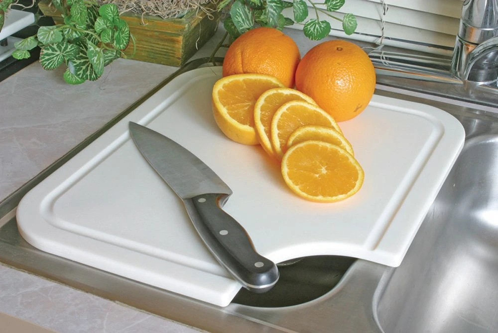 White Plastic Sink Mate Cutting Board by Camco®. Sits on top of your RV’s or boat’s kitchen sink to increase work space. It is ideal for cleaning, carving and chopping. Won’t nick or dull knives. Features a cut corner for scraps and a built-in juice groove. Adjustable rubber feet adapt to your sink size.