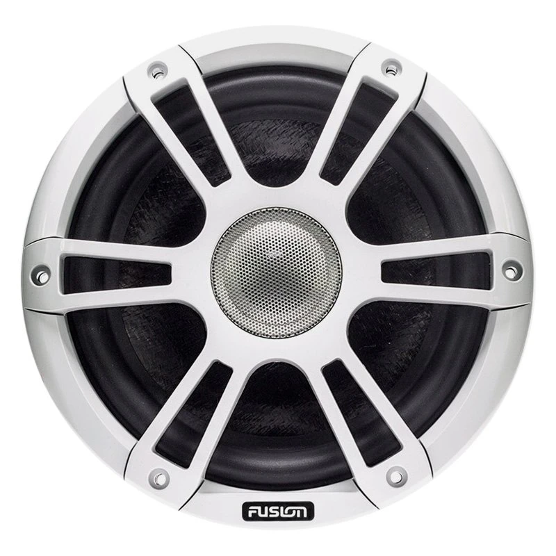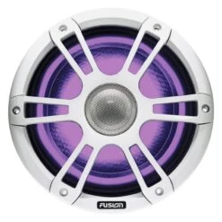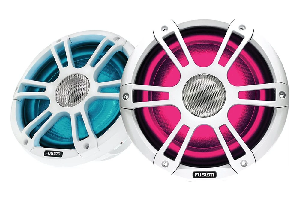 Signature Series 3 330W Sports White Speakers with LED Lighting (010-02434-10) by Fusion®. Pushing the boundaries of what is possible on the water even further, the new revamped Fusion Signature Series 3 marine speakers deliver unparalleled performance even when exposed to the harshest marine conditions. Incorporating the finest materials and latest acoustic technologies, we have combined ‘CURV’ cone composite technology with a silk dome tweeter and fully sealed crossover components to create a speaker system with a stunning signature sound for premium on-water listening. The sports-style Signature Series 3 speakers feature industry-1st CRGBW LED lighting to illuminate your vessel with an unprecedented spectrum of colors, to help set the mood or start the party with premium, more ambient lighting. These 8.8″ Signature Series 3 speakers can handle up to a thunderous 330 Watt peak power, so you can truly experience “The Power Of Music”.