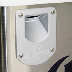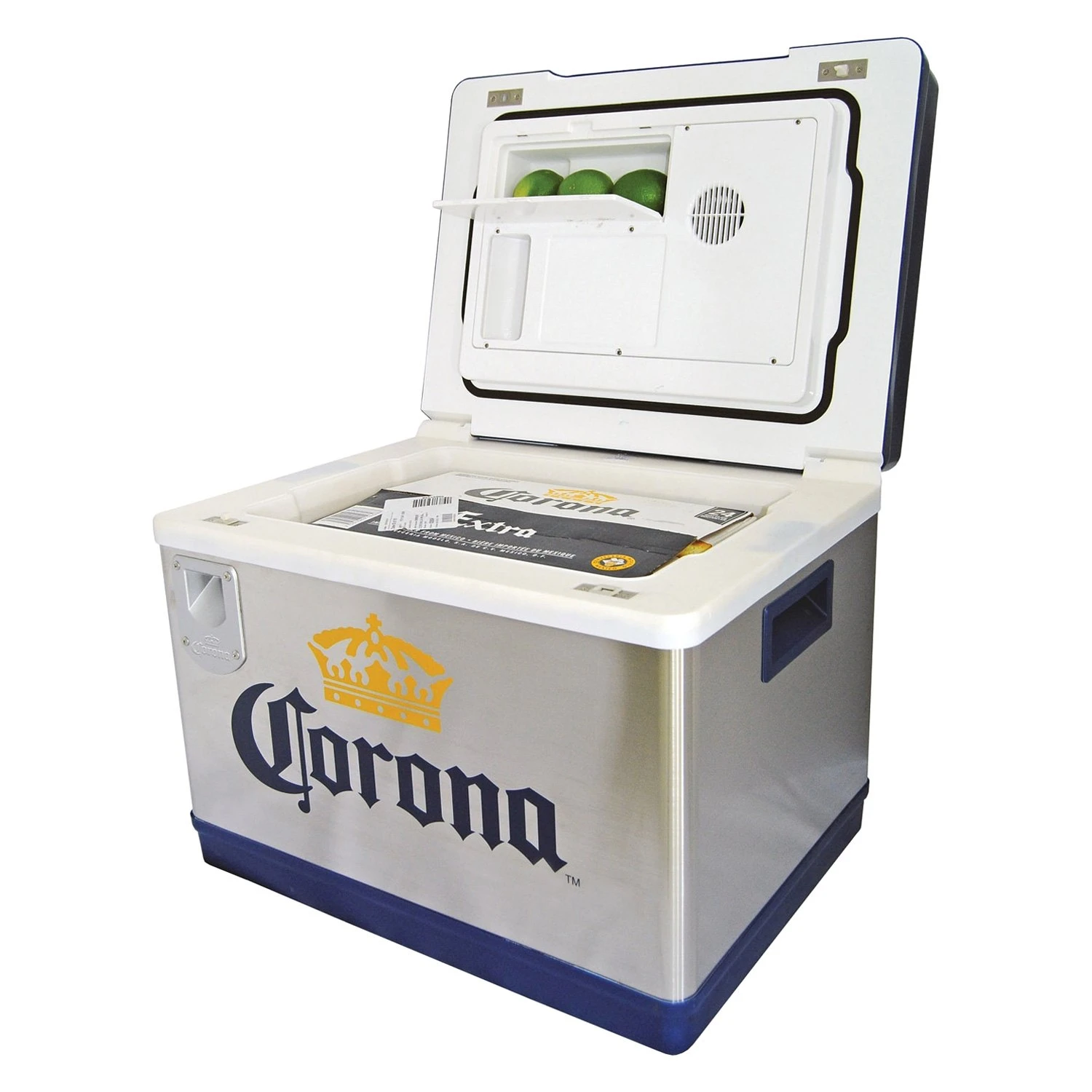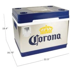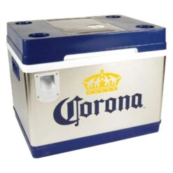 - They put the cooling module in the lid to make sure this 42 L / 44 qt cooler could comfortably hold a full 24-bottle case of beer for easy access at tailgate parties, barbecues, or camping Eye-catching stainless steel exterior with rugged plastic accents and classic Corona™ logo make this unique cooler the perfect gift for fans of beer, camping, RV-ing, BBQ-ing, or outdoor travel Corona™-lovers will appreciate the added convenience of the built-in bottle opener, beverage holders, lime storage compartment, citrus knife, and cutting board Corona™ Cruiser uses iceless thermoelectric cooling technology to keep contents cool to 40°F (22°C) below ambient temperature with minimal power consumption 12V DC/110V AC capable for use at home or in your vehicle with easy-carry handles for transport