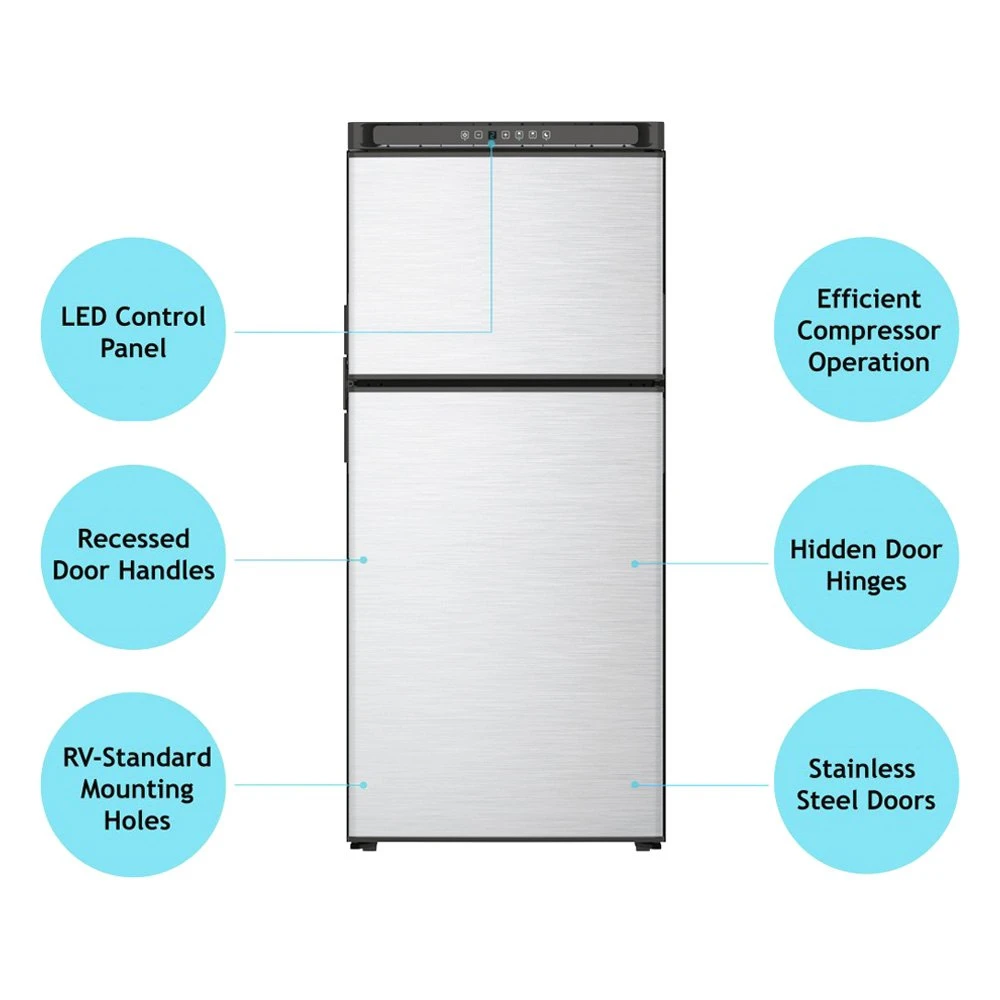 Polar™ 8 cu ft Matte Black Right Hand AC/DC Built-In Double Door RV Refrigerator & Freezer (N8DCBKR) by Norcold®. Delivers value, ease-of-use, abundant storage & exceptional styling. Bring the comforts of your home to your motorhome with this top-notch RV appliance to make your camping experience more enjoyable and free of worries. It’s made to be compact and lightweight to suit your RV lifestyle while delivering rugged strength and durability to withstand the extensive use and the elements. Designed to add more convenience and practicality to your RV, this appliance provides an economical and efficient way to tackle your daily routines.