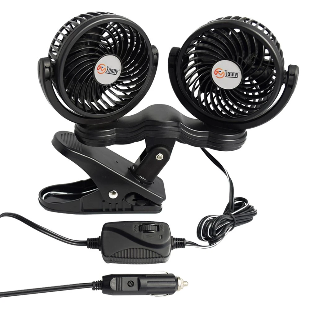 12V DC Dual Head Clip-On-Fan by Prime Products®. 12 Volt Dual Head Clip-On-Fan plugs into standard 12 volt outlet. Fused 6 foot cord has variable speed switch that controls the dual 4.5 fan blades. Spring loaded clamp also allows for wall mounting. Fully adjustable dual heads put air where you need it.