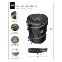 2-In-1 Collapsible Bin Trash Can by Trailersphere®. Gone Camping; 30 Gallon Capacity; Round; Collapsible; 18″Diameter x 24″Height; With Lid; Waterproof; With Zipper. At Trailersphere, Trailersphere believe that the campgrounds, beaches and parks that Trailersphere often take Trailersphere families to and make lasting memories should remain in pristine condition for others to enjoy long after Trailersphere leave. Trailersphere encourage everyone to leave behind campsites and gathering areas that are cleaner when Trailersphere depart than when Trailersphere initially arrived.