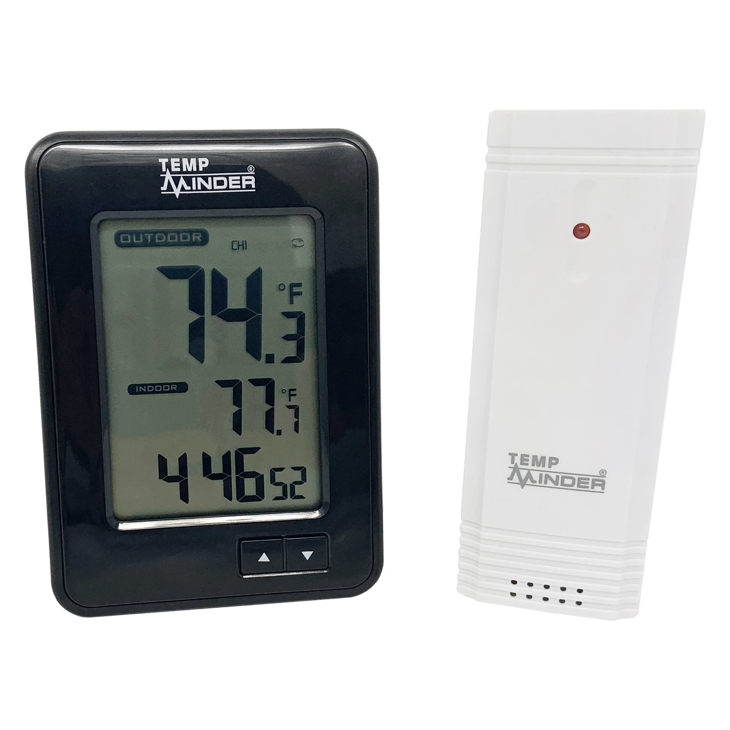TempMinder™ Wireless Thermometer & Clock by Valterra®. Designed for RV and home use, the TempMinder Wireless Thermometer and Clock allows you to receive wireless temperature readings from up to three remote sensors (one sensor included) from up to 165′ away. The Thermometer also stores minimum and maximum temperatures. Displays temps in Celsius or Fahrenheit. User-selectable 12/24-hour clock. Display operates on two AAA batteries; sensor operates on two AA batteries.