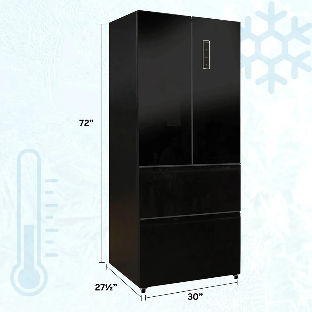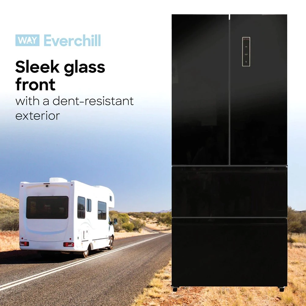 Everchill™ High-Capacity 16.2 cu ft French 4 Doors RV Refrigerator by Way Interglobal®. The Best Looking High-Capacity RV Refrigerator on the Market. Upgrade the look and capacity of your RV kitchen with the Everchill Premier Series 16.2 cu ft 110 Volt Refrigerator from Way. Store more food for your long adventures and have a sleek look that completes the aesthetics of your RV kitchen with Way Interglobal newest model featuring a black stainless steel finish.