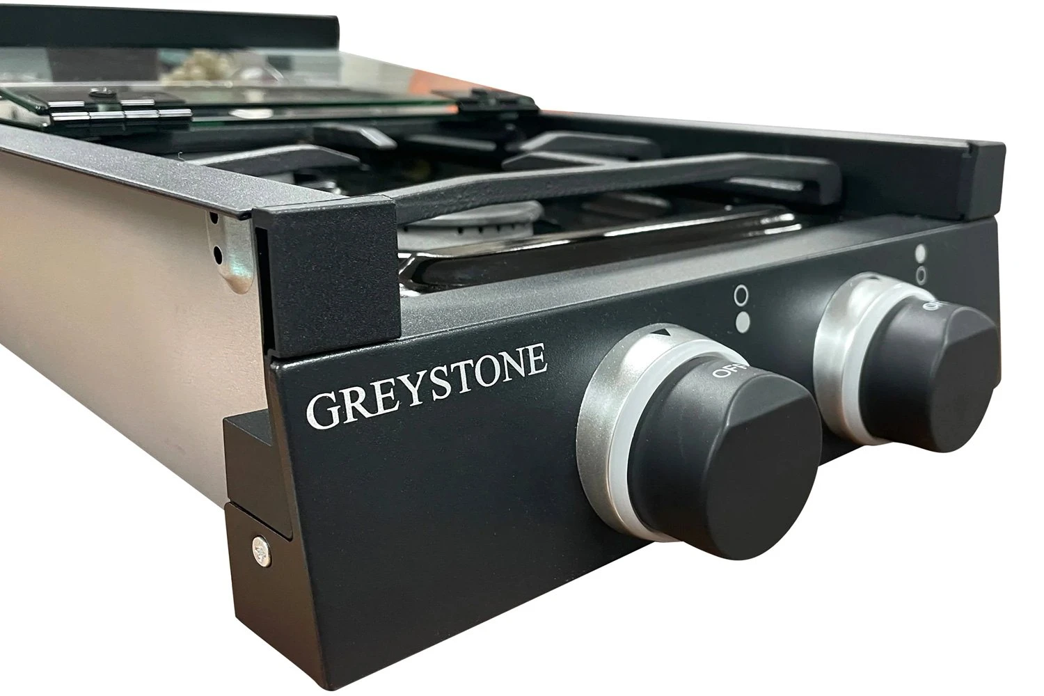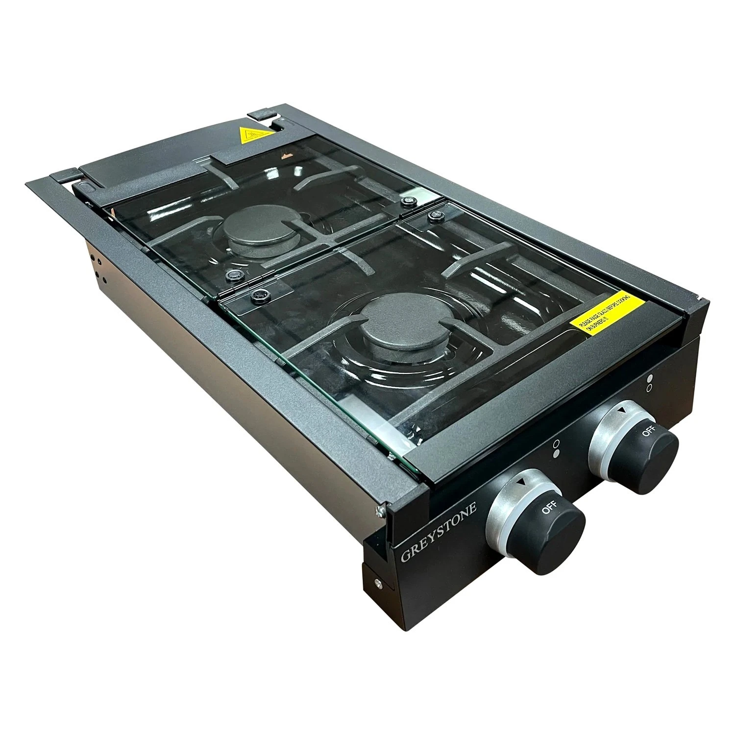 Greystone™ Premium Double Burner LP Gas Cooktop by Way Interglobal®. For Built-in Gas Cooking. Having the ability to cook your own food while on the road is a terrific perk of RVing. Not only is cooking your own food a money saver there are other benefits including saving time and providing healthier options than takeout or fast food. Sometimes, though, you don’t have enough room for a full oven or even for a microwave. In these situations, you can use other solutions like the Greystone Premium Double Burner Gas Cooktop. With cooktops, you may prepare meals over the stove without taking up additional cabinet room beneath it. Cooktops are an excellent way to add cooking capabilities to small pop-up campers.