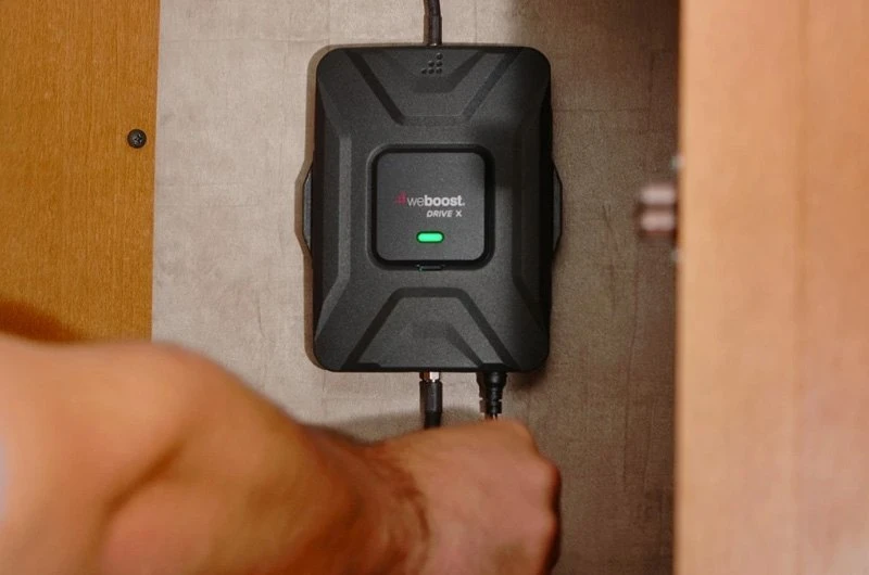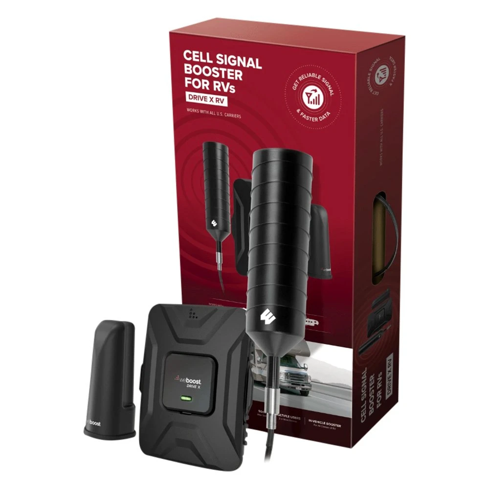 Drive X RV Cellular Phone Signal Booster by weBoost®. Is a versatile, multi-user, in-vehicle cell signal booster – designed for use with all RV classes and towable trailers. Backed by up to 50 dB max gain, the Drive X RV delivers the strongest cell signal possible on all available network speeds. The enhanced outside antenna’s modular design allows for custom setup and optimal positioning for signal reception. Whether parked or on the road, Drive X RV users experience fewer dropped calls, better voice quality, uninterrupted texts, faster data speeds, better streaming, and improved hotspot capability.