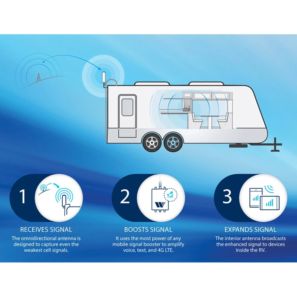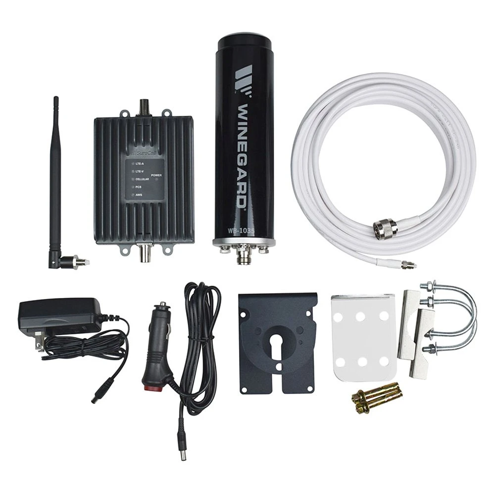 Black Voice/Text And 4G Lte Cellular Signal Booster by Winegard®. The Winegard RangePro enhances voice, text, and 4G LTE cellular signals for all North American carriers, improving connectivity for multiple cellular devices inside your RV. The RangePro Cell Booster is uniquely built for RV users who want the best cell signal—whether you’re out on the road or closer to home. That means a more reliable in-motion 4G LTE connection and improved data speeds. Cell tower signals are captured by the exterior antenna and transmitted via a low-loss coax cable inside the RV, bypassing all major obstructions. The signal is then boosted and rebroadcast throughout the vehicle using the indoor booster with attached indoor omnidirectional whip antenna. With a high-gain antenna for maximum signal strength, and direct signal communication to the booster, RangePro users experience steady cellular connections, even in weak cell service areas.